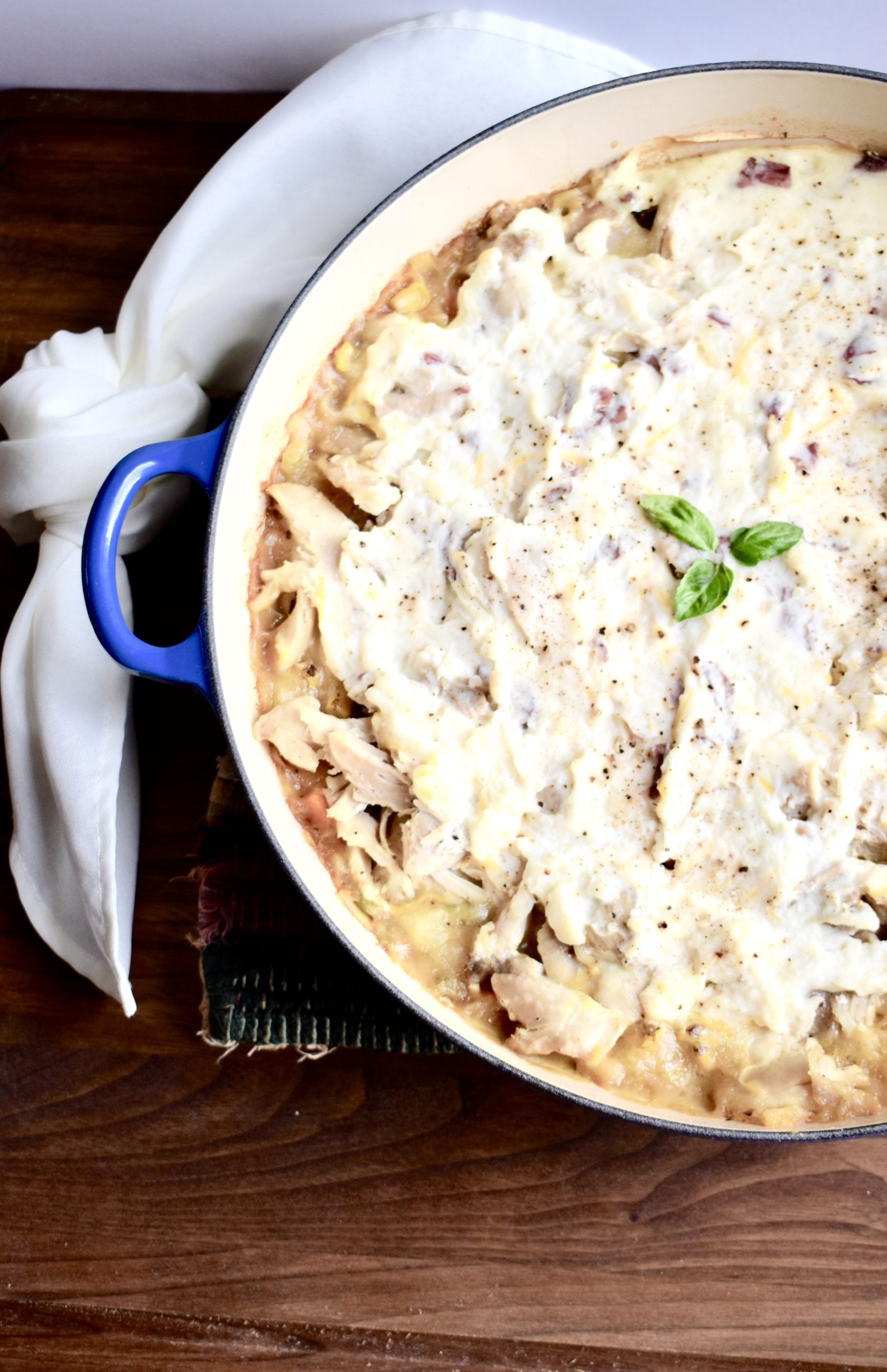 *If your skillet is not oven safe, you can build the layers in a greased 9x13 pan. Layer the chicken & veggie mix on the bottom, the cheese next, and the mashed potatoes on top. Cover with foil and bake.